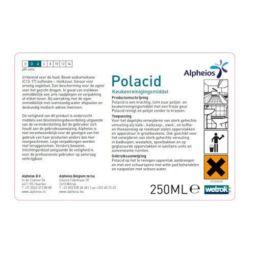 Polacid is een krachtig, licht zuur polijst- en keukenreinigingsmiddel met een frisse geur voor het dagelijks verwijderen van sterk vuil en hardnekkige vervuiling.