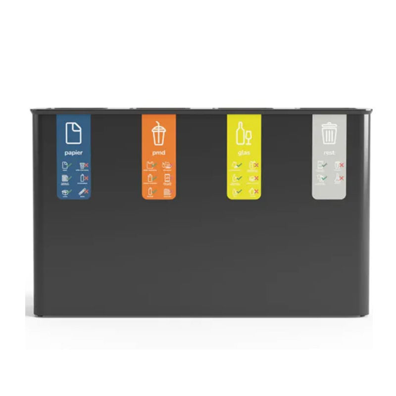 Bij aankoop ontvang je een stickerpakket bestaande uit: Rest – Papier – Pmd – Gft – Cups stickers. Laat het ons graag voor levering weten als je deze stickers in het Engels zou willen ontvangen. De magneetstickers aan de voorzijde van de bak zijn exclusief dit pakket en dienen apart bijbesteld te worden.
