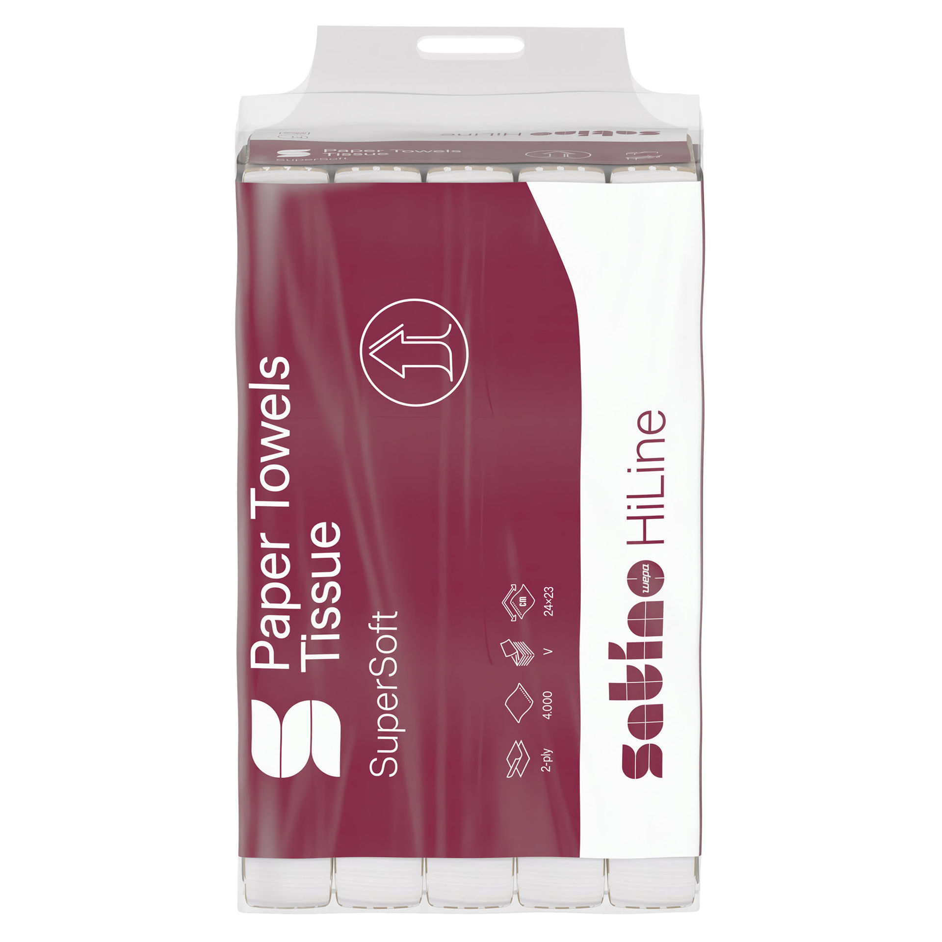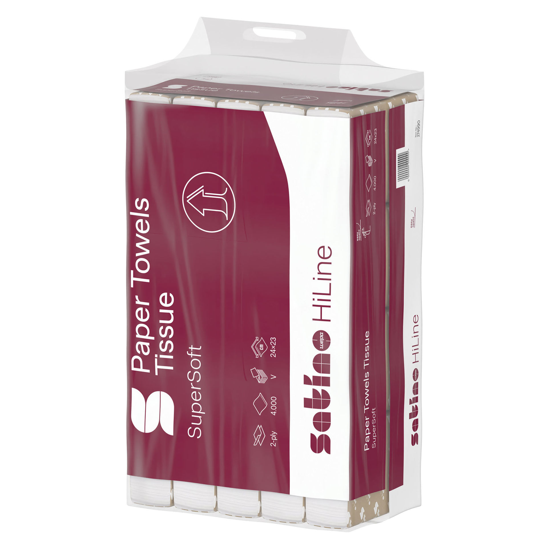 Het Satino HiLine 24x23 2-laags V-vouw handdoekpapier overtuigt door hoge kwaliteit, betrouwbare absorptie en een aangename haptiek. Binnen de HiLine-lijn staat hoogwaardige cellulose centraal, met een helderwitte uitstraling die perfect past in verzorgde en professionele sanitaire ruimtes.