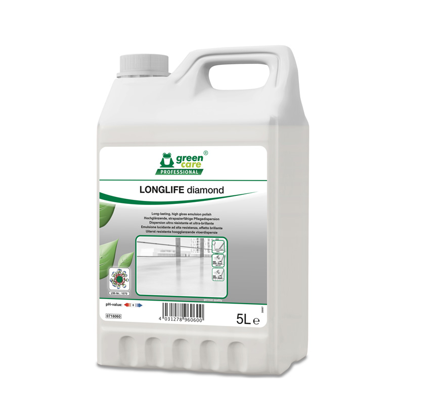 LONGLIFE diamond is een hoogglanzende en slijtage bestendige verzorgingsdispersie die de vloer langdurig beschermt.