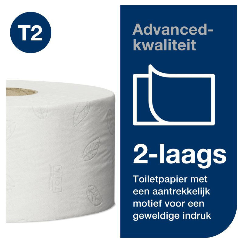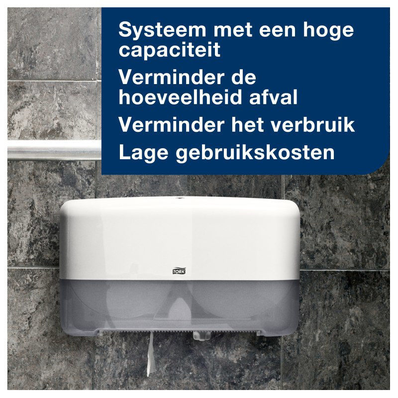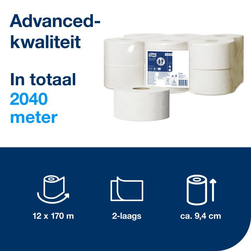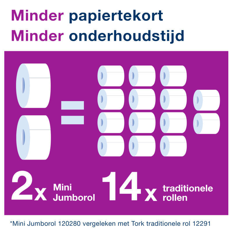 Het Tork Mini Jumbo-systeem is efficiënt en kostenbesparend en biedt tegelijkertijd meer toiletpapier dan traditionele rollen. Tork Mini Jumbo Toiletpapier Advanced 2-laags vormt een goede balans tussen kosten en prestaties en is ideaal voor locaties met een middelmatig tot groot aantal bezoekers.
